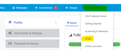 You have two options for accessing the online PKSB tool. The first approach involves going to your member profile page (you may be prompted to log in if you have not already) and select the Quick Links dropdown from the light blue horizontal menu and select PKSB from the available items.